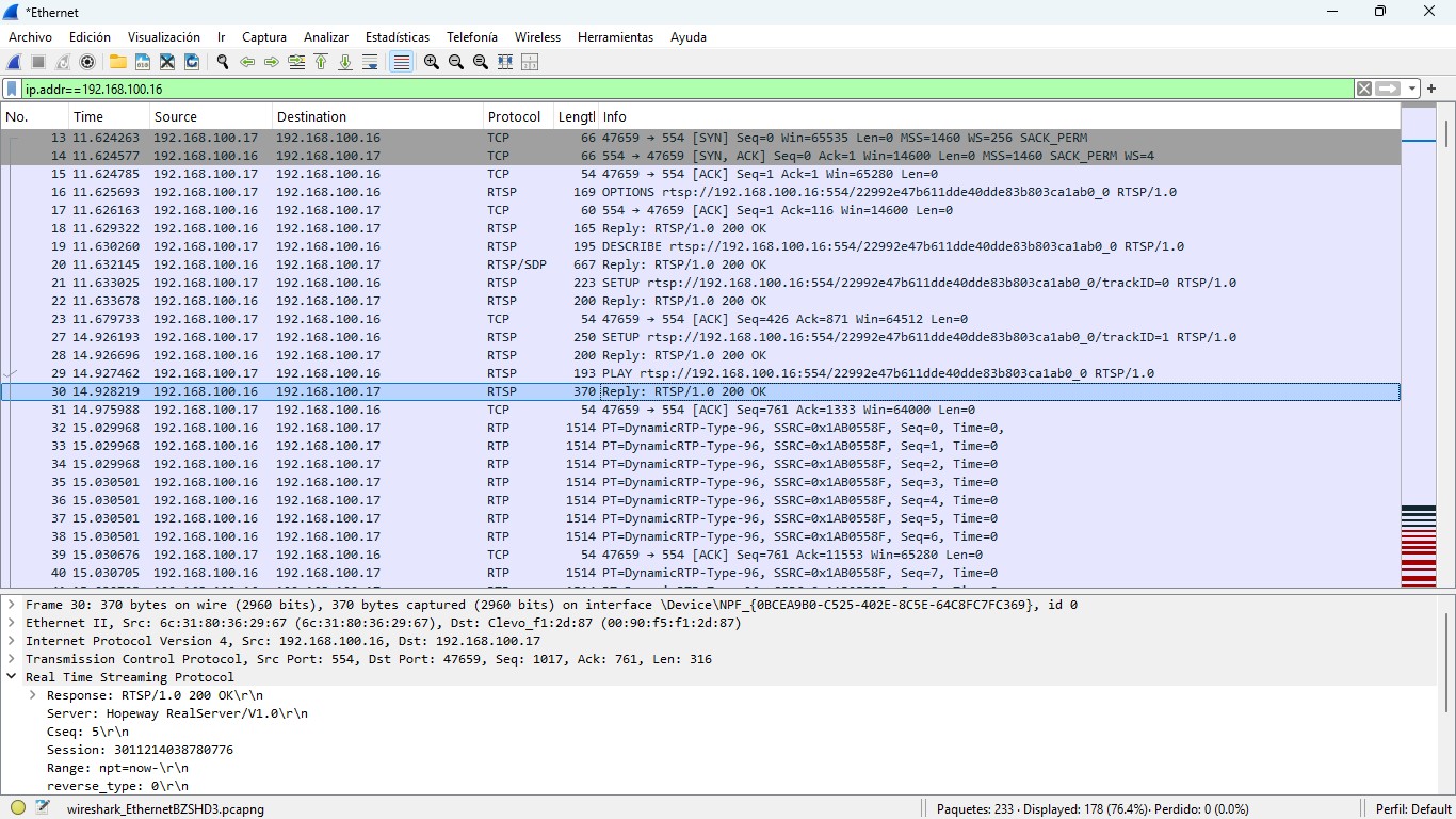 sin embargo con el metodo "OPTION" que no veo que usa la aplicacion oficial mediante WireShark si devuelve la SessionID que es requerida por otros Metodos de RTSP